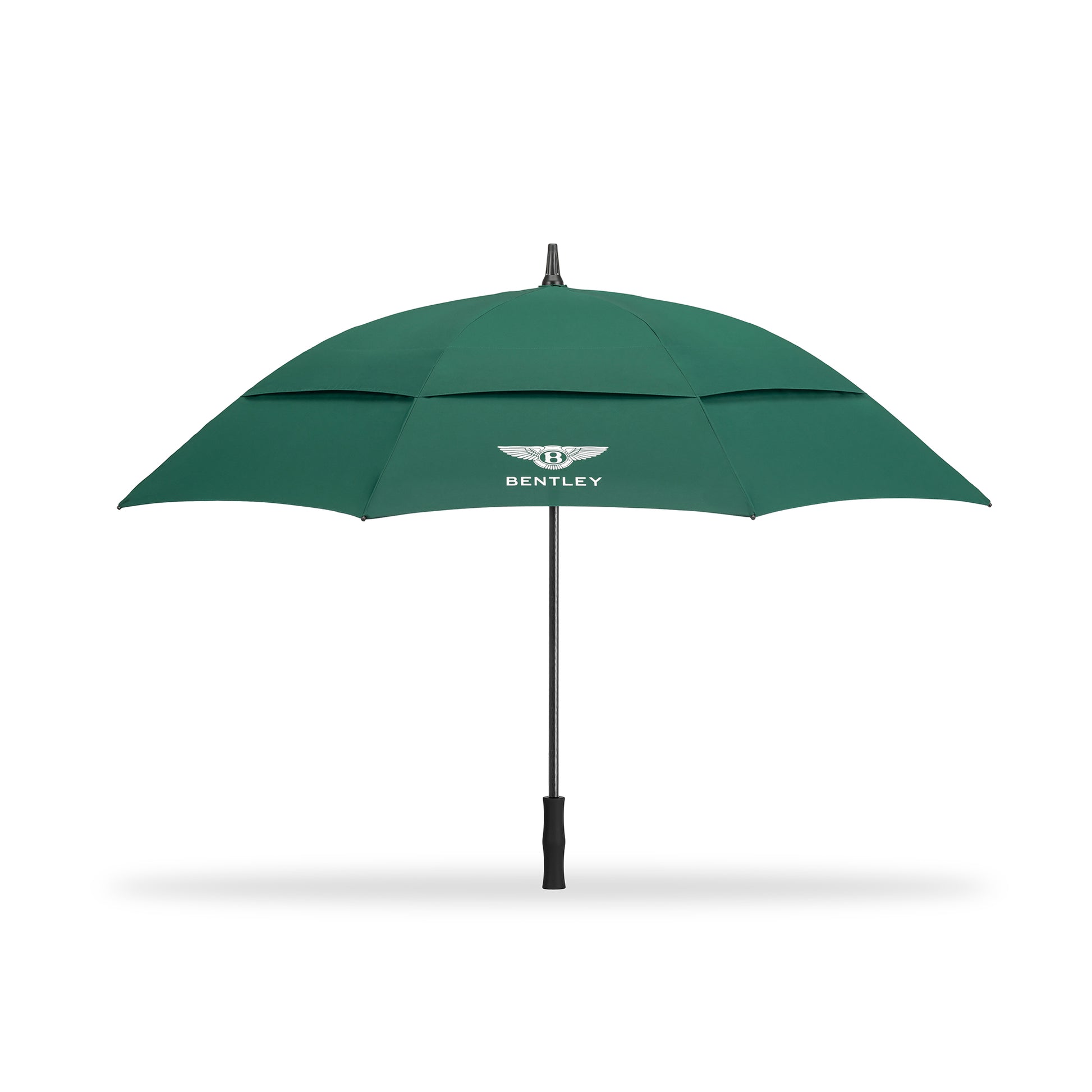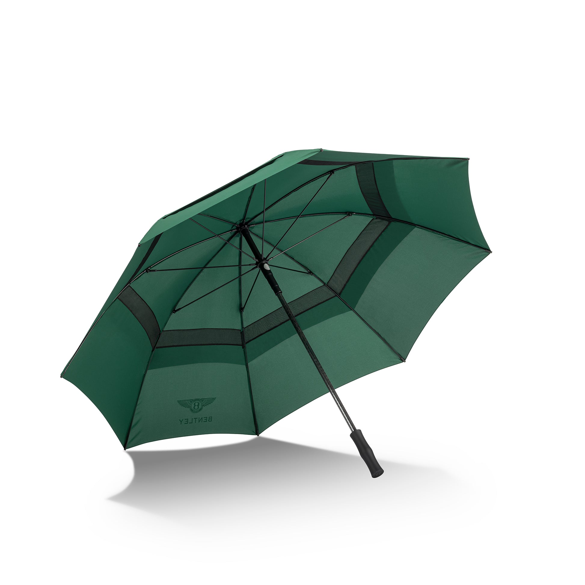 A stylish wet-weather option, our ultimate Green Vented Golf Umbrella boasts a 150cm water-resistant canopy, stylized B on the soft touch rubber handle and a silver Bentley logo on one panel.
