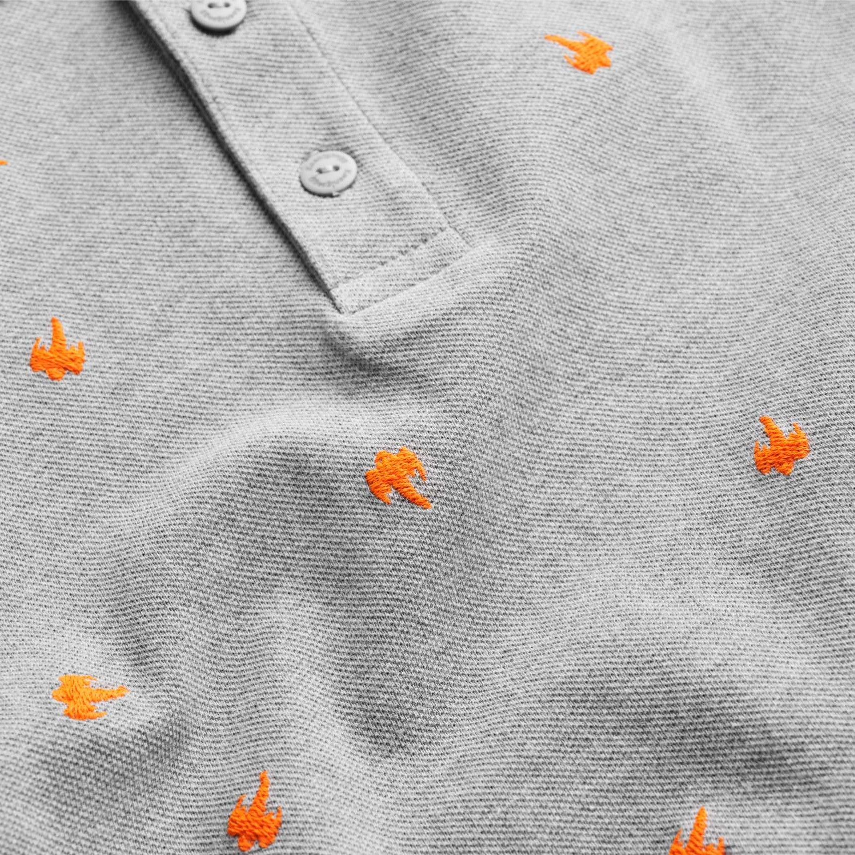 This grey polo shirt is made from 100% organic cotton, and features small, orange, embroidered Koenigsegg ghosts in a pattern over the entire garment.