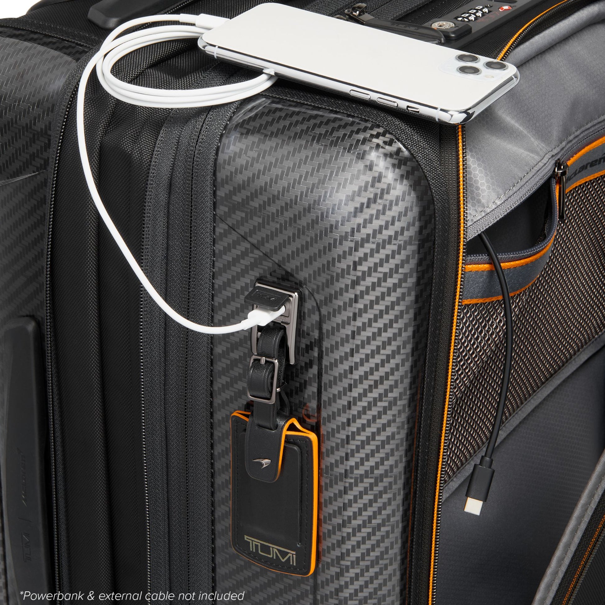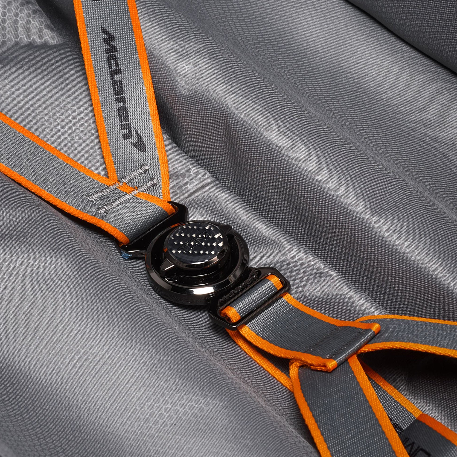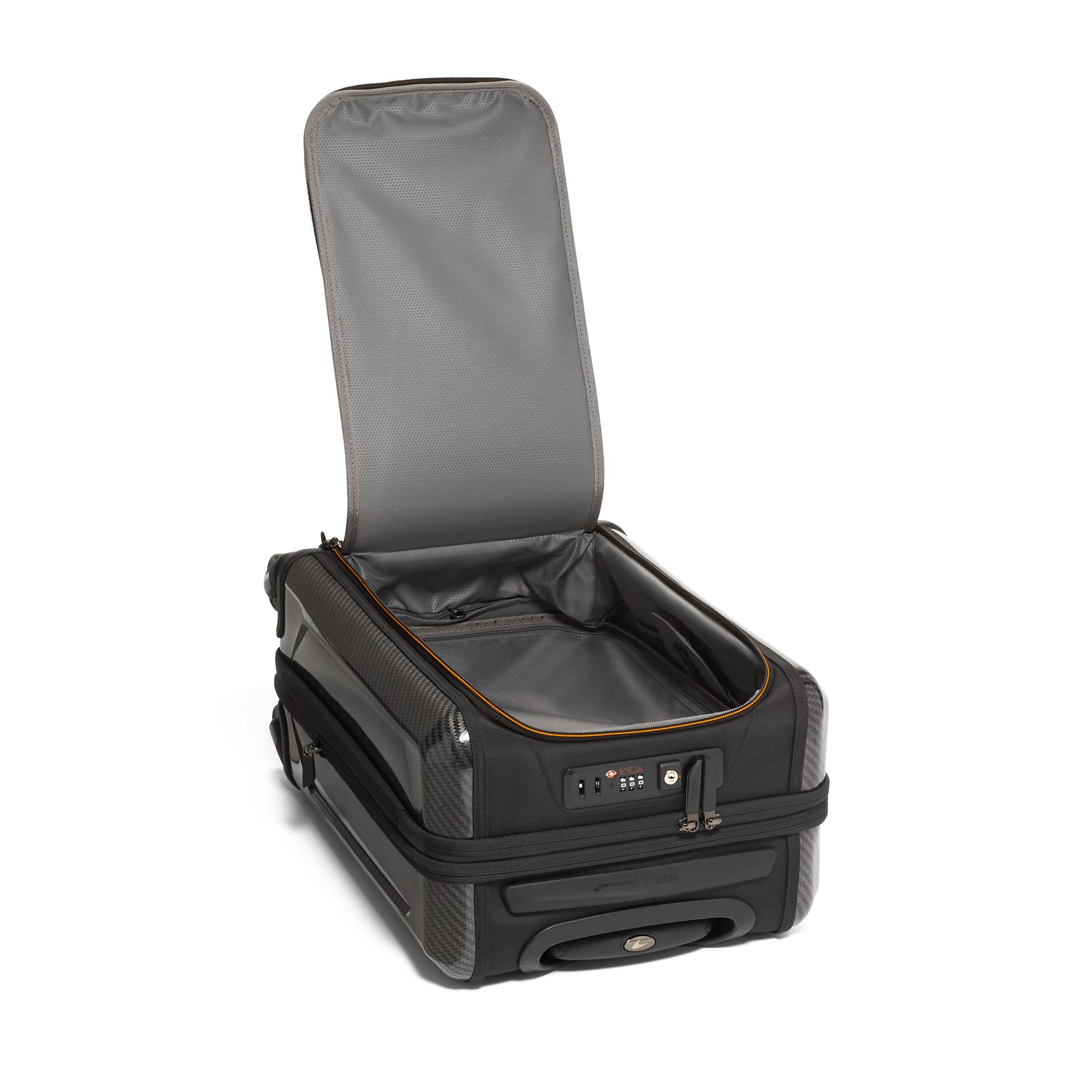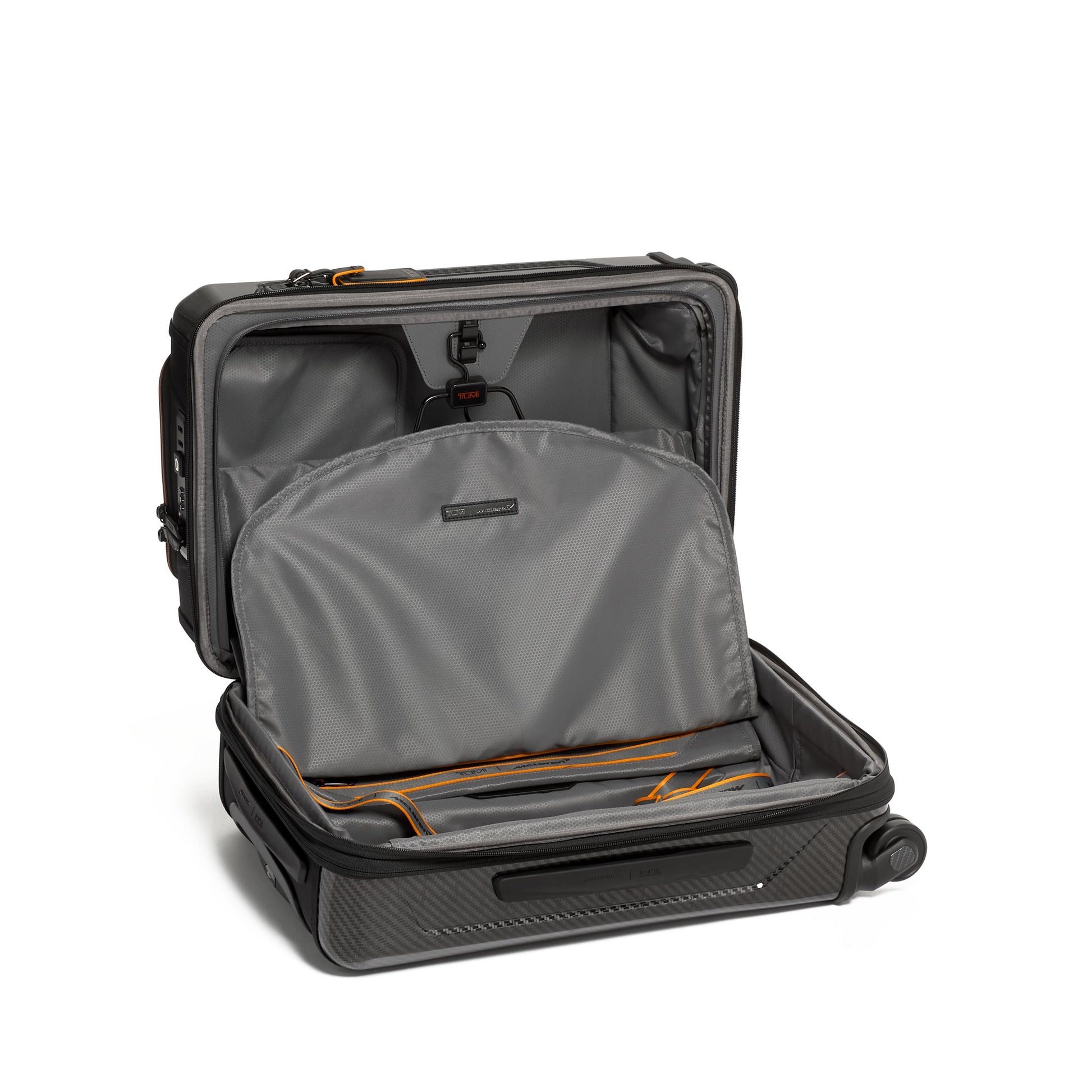 Echoing automotive inspiration inside and out, this exceptionally durable carry-on boasts a sleek silhouette, CX6 carbon fiber accents and compression straps reminiscent of McLaren's 5-point harness.