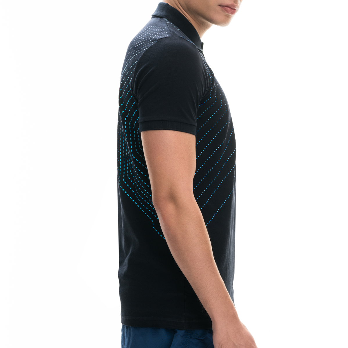 Detailed button-collared neckline, customized with a blue accent.