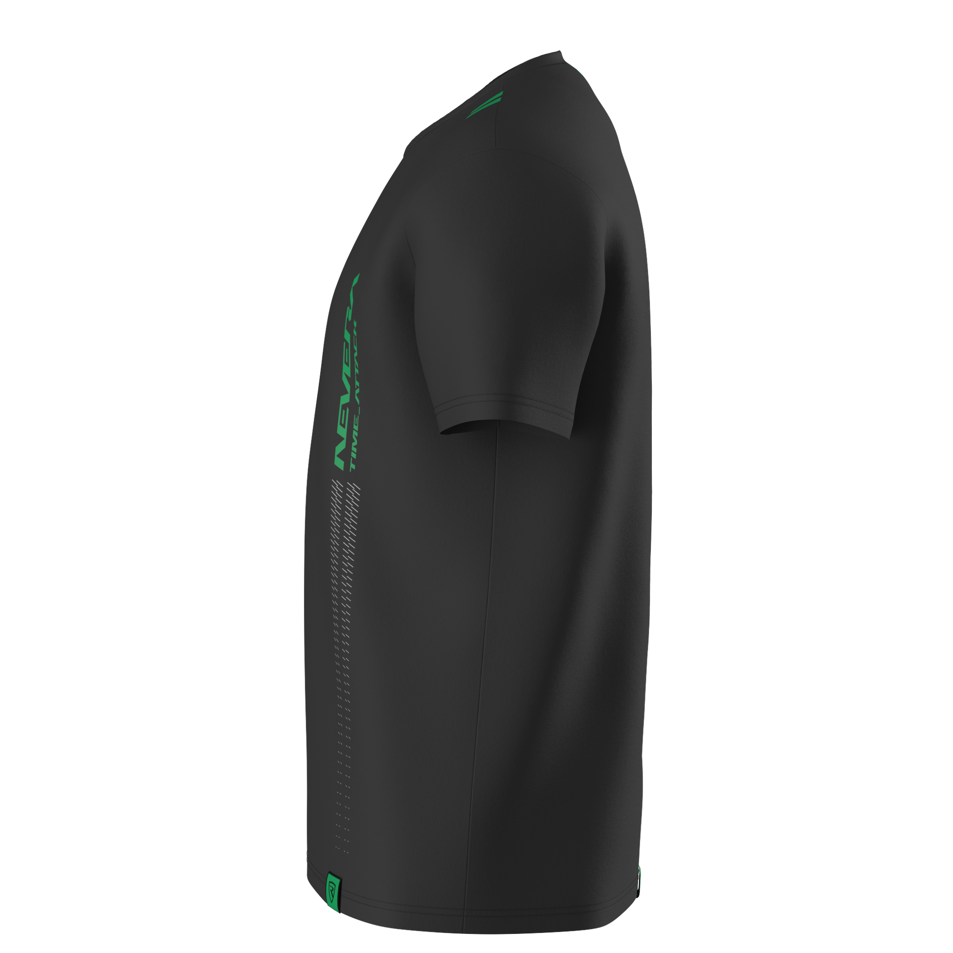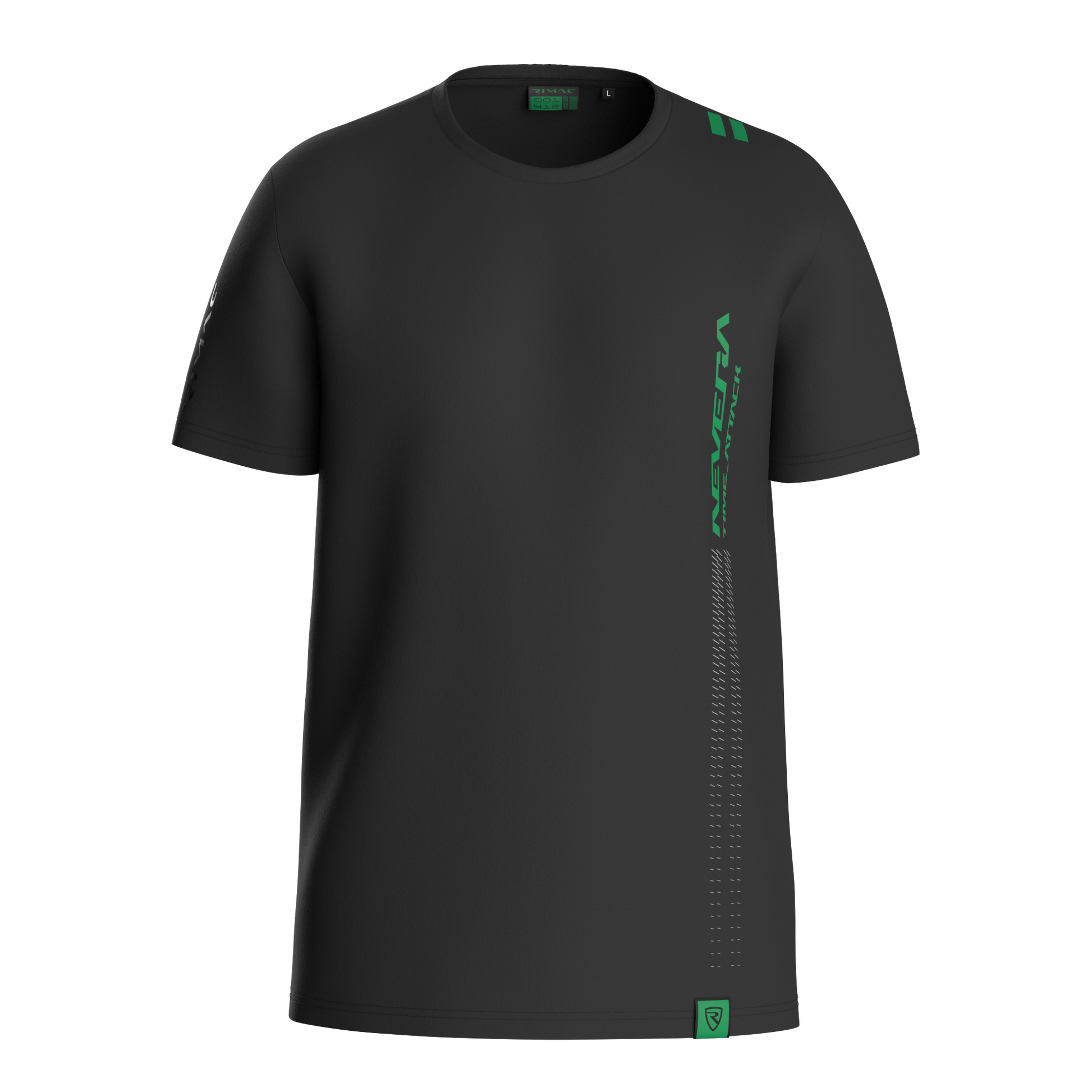 100% cotton black t-shirt with lightning green “Nevera Time Attack” with speed lines print on the front and Black Rimac logo detail on the left sleeve.