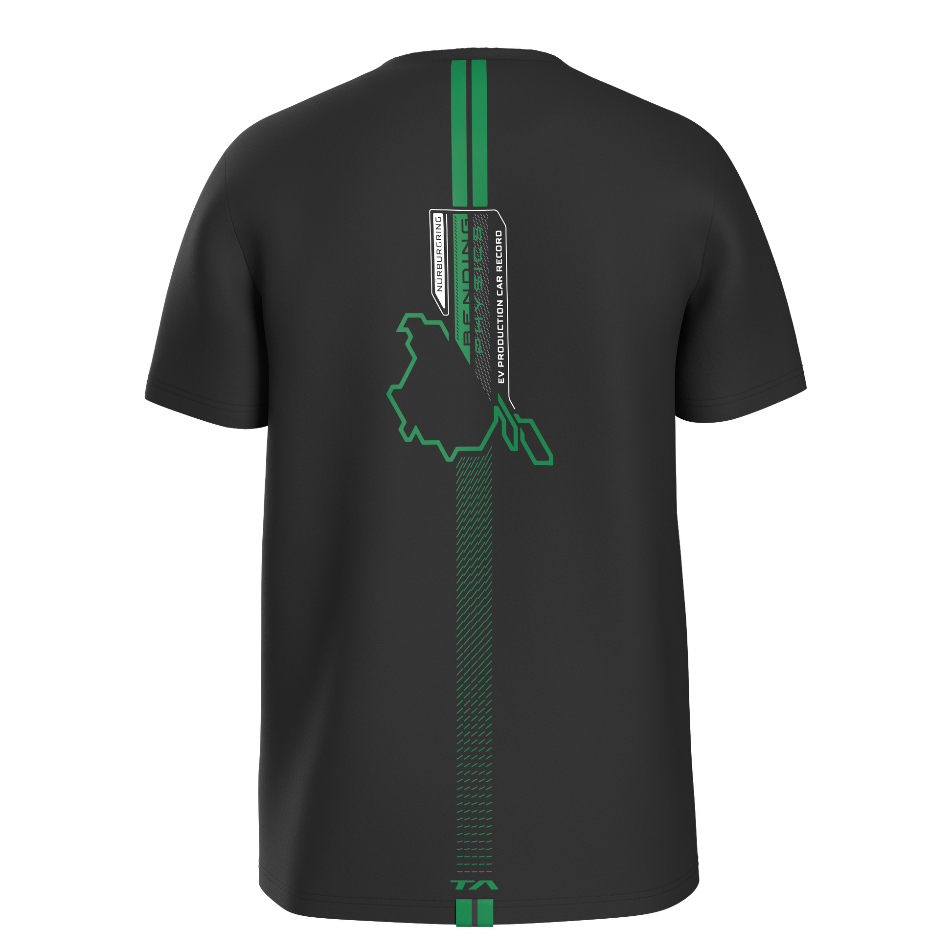 Back side features the outline of the Nürburgring racetrack with EV production record print and lightning green racing lines with Bending physics inscription with subtle GLOW IN THE DARK effect.